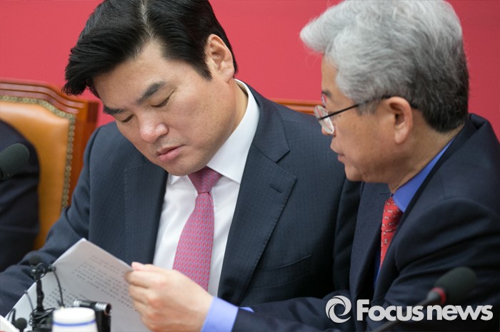 (서울=포커스뉴스) 테러방지법 직권상정에 반발해 야당의 무제한 토론(필리버스터)이 진행되고 있는 24일 오후 서울 여의도 국회에서 열린 새누리당 원내대표단-정보위원회 연석회의에 참석한 원유철(왼쪽) 원내대표와 이철우 정보위 여당 간사가 대화하고 있다.