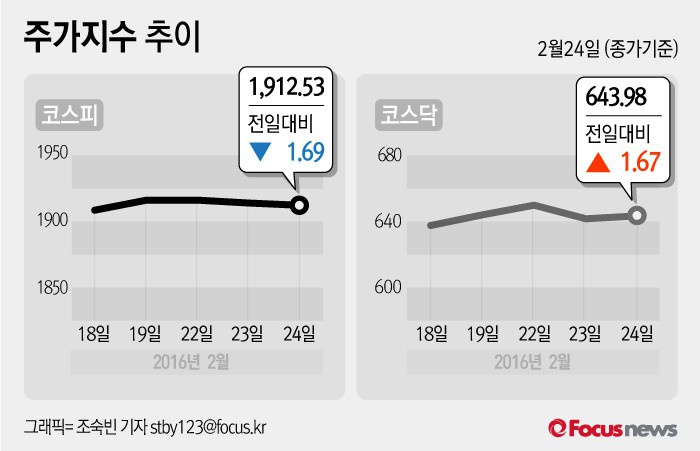 24일 코스피지수는 전일 대비 0.09%(1.69포인트) 내린 1912.53에 장을 마쳤다. 코스닥지수는 전날 보다 0.26%(1.67포인트) 오른 643.98에 마감했다.