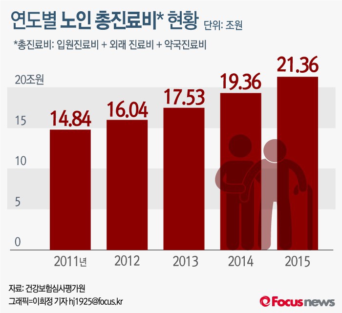 (서울=포커스뉴스) 24일 건강보험심사평가원이 발표한 ‘2015년 진료비 심사실적 통계’에 따르면 2015년 노인 총진료비는 21조3615억원인 것으로 조사됐다. 이는 건강보험 진료비의 36.8% 수준이다.
