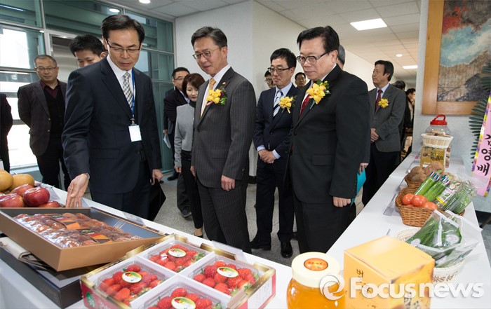 (안성=포커스뉴스) 24일 오후 경기 안성시 하나원에서 열린 하나원 농업·농촌 홍보관 개관식에서 이동필 농림축산식품부 장관과 홍용표 통일부 장관이 농촌 정착 북한 이탈주민들이 생산한 농산물을 둘러보고 있다.