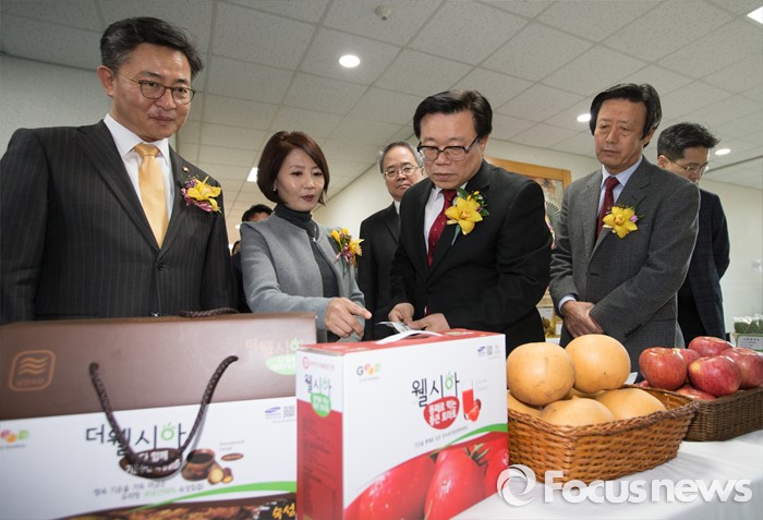 (안성=포커스뉴스) 24일 오후 경기 안성시 하나원에서 열린 하나원 농업·농촌 홍보관 개관식에서 이동필 농림축산식품부 장관과 홍용표 통일부 장관이 농촌 정착 북한 이탈주민들이 생산한 농산물을 둘러보고 있다.