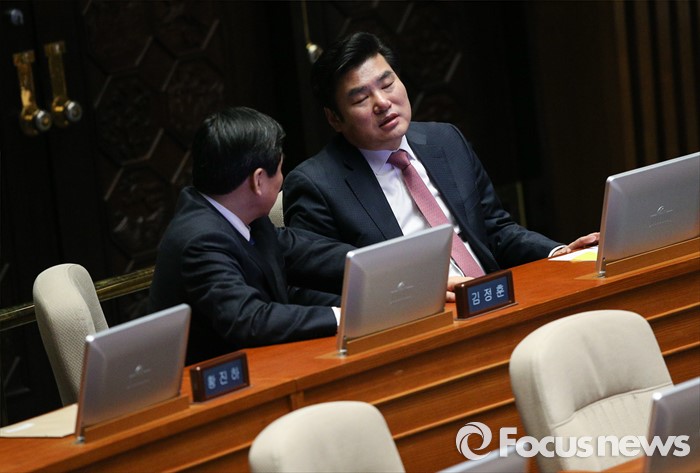 (서울=포커스뉴스) 박원석 정의당 의원이 24일 오후 서울 여의도 국회 본회의장에서 테러방지법의 본회의 의결을 막기 위한 필리버스터(무제한 토론을 통한 합법적 의사진행 방해)를 하고 있는 가운데 원유철(오른쪽) 새누리당 원내대표와 이종걸 더불어민주당 원내대표가 대화를 나누고 있다.