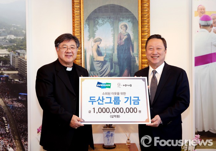 두산그룹은 소외된 이웃을 위해 2012년부터 재단법인 ‘바보의 나눔’에 매년 10억원씩 기부하고 있다.박용만 두산그룹 회장(오른쪽)이 24일 서울 명동성당에서 조규만 재단법인 '바보의 나눔' 이사장에게 성금 10억원을 전달하고 있다. <사진제공=두산그룹>