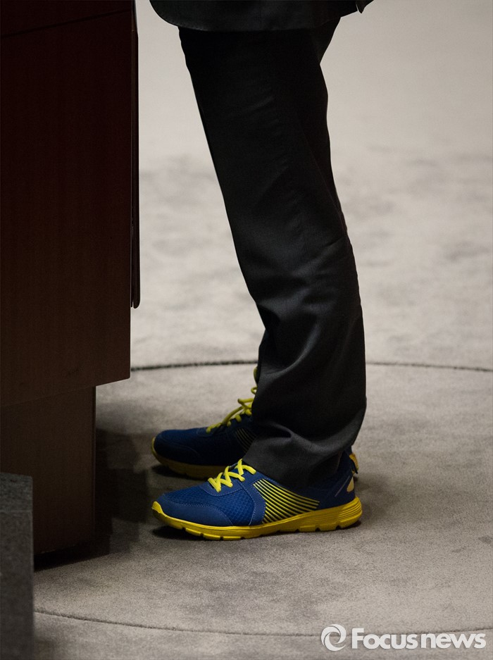 (서울=포커스뉴스) 박원석 정의당 의원이 24일 오후 서울 여의도 국회 본회의장에서 운동화를 신고 테러방지법 본회의 의결을 막기 위한 필리버스터(무제한 토론을 통한 합법적 의사진행 방해)를 하고 있다.