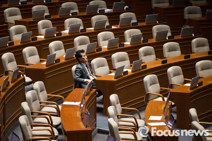 (서울=포커스뉴스) 박원석 정의당 의원이 24일 오후 서울 여의도 국회 본회의장에서 테러방지법의 본회의 의결을 막기 위한 필리버스터(무제한 토론을 통한 합법적 의사진행 방해)를 하고있는 가운데 텅빈 의석들 속에 한 의원이 앉아 있다.