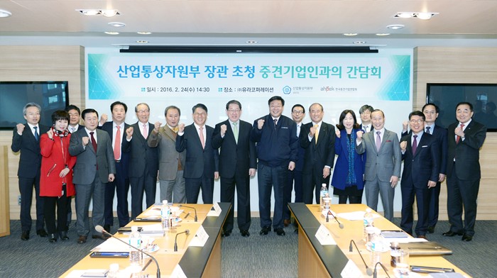 (성남=포커스뉴스) 주형환 산업통상자원부 장관이 24일 오후 경기도 판교에 소재한 자동차 전장부품생산 중견기업인 ㈜유라코퍼레이션 회의실에서 열린 중견기업계 대표들과의 간담회에 참석해 기념촬영 하고 있다.