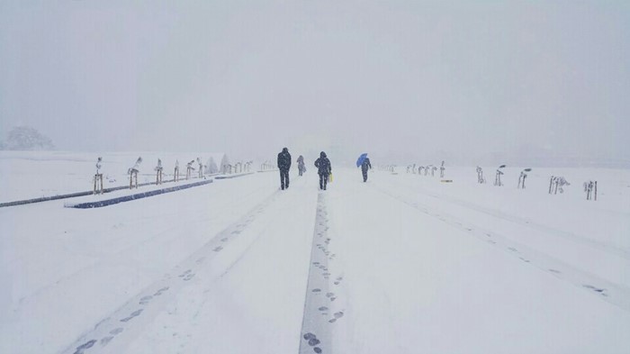 (서울=포커스뉴스) 전국이 대체로 맑겠으나 강원도 영동과 경상남북도 동해안은 동풍의 영향으로 흐리며 눈 또는 비가 올것으로 예보된 24일 경북 포항시 국립등대박물관 인근 도로에서 시민들이 국지성 폭설로 인해 차량운행이 불가능하자 걸어서 출근하고 있다. <사진제공=독자>