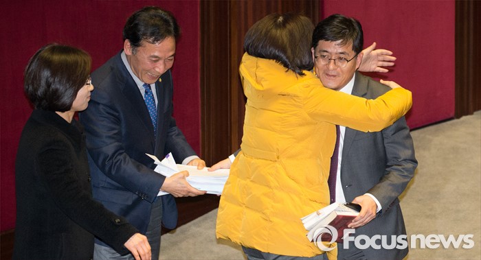 (서울=포커스뉴스) 테러방지법 직권상정에 반발해 야당의 무제한 토론(필리버스터)이 진행되고 있는 24일 오후 서울 여의도 국회 본회의장에서 박원석 정의당 의원이 발언을 마치고 심상정 정의당 대표와 포옹을 하고 있다.