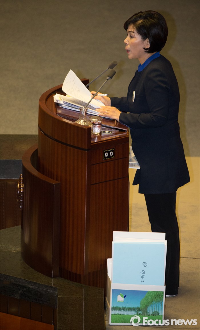(서울=포커스뉴스) 테러방지법 직권상정에 반발해 야당의 무제한 토론(필리버스터)이 진행되고 있는 25일 새벽 서울 여의도 국회 본회의장에서 최민희 더불어민주당 의원이 발언을 하고 있다.