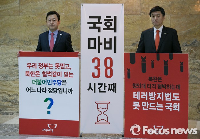 (서울=포커스뉴스) 테러방지법 직권상정에 반발해 야당의 무제한 토론(필리버스터)이 사흘째 진행되고 있는 25일 오전 서울 여의도 국회 본회의장 앞에서 김용남(왼쪽), 심윤조 새누리당 의원이 무제한 토론을 비판하는 시위를 하고 있다.