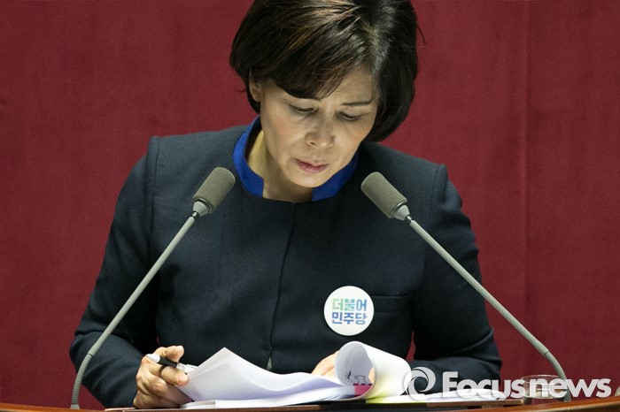 (서울=포커스뉴스) 최민희 더불어민주당 의원이 25일오전 서울 여의도 국회 본회의장에서 테러방지법 저지를 위한 무제한토론(필리버스터)을 하고 있다.