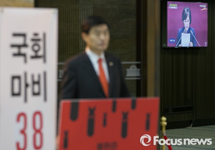 (서울=포커스뉴스) 테러방지법 직권상정에 반발해 야당의 무제한 토론(필리버스터)이 사흘째 진행되고 있는 25일 오전 서울 여의도 국회 본회의장 앞에서 심윤조 새누리당 의원이 무제한 토론을 비판하는 시위를 하고 있다.