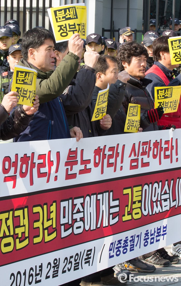 (세종=포커스뉴스) 25일 오전 세종시 정부세종청사 국무총리실 앞에서 민중총궐기 충남 운동본부 구성원들이 기자회견을 열고 박근혜 정권 출범 3년 민중궐기대회에서 민중의 분노를 보여주겠다고 주장하고 있다.