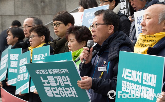 (서울=포커스뉴스) 29일 오전 서울 종로구 세종문화회관 앞에서 열린 '박근혜 정권 3년 평가 기자회견'에서 최종진(오른쪽 두번째) 전국민주노동조합총연맹 수석부위원장이 발언하고 있다.