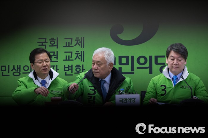 (서울=포커스뉴스) 국민의당 안철수, 천정배 상임공동대표를 비롯한 지도부가 25일 오전 서울 마포 당사에서 선거대책위원회 회의를 하고 있다. 오른쪽부터 안 대표, 김한길 공동선대위원장, 천 대표