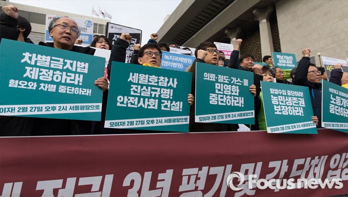 (서울=포커스뉴스) 29일 오전 서울 종로구 세종문화회관 앞에서 열린 '박근혜 정권 3년 평가 기자회견'에 참석한 전국민주노동조합총연맹 등 각 단체 조합원들이 박근혜 정부를 규탄하는 구호를 외치고 있다.
