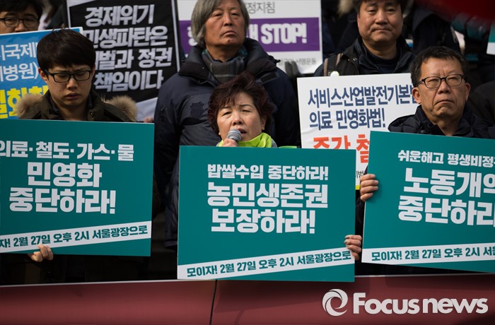 (서울=포커스뉴스) 29일 오전 서울 종로구 세종문화회관 앞에서 열린 '박근혜 정권 3년 평가 기자회견'에서 김순애(가운데) 전국여성농민회총연합 회장이 발언하고 있다.