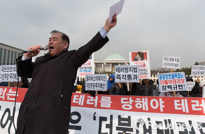 (서울=포커스뉴스) 25일 오전 서울 여의도 국회 앞에서 어버이연합을 비롯한 보수단체가 야당의 테러방지법 반대를 위한 무제한토론(필리버스터) 중단을 요구하며 기자회견을 하고 있다.