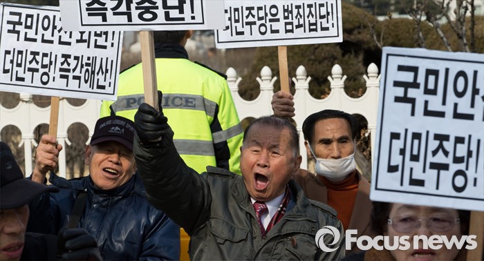 (서울=포커스뉴스) 25일 오전 서울 여의도 국회 앞에서 어버이연합을 비롯한 보수단체가 야당의 테러방지법 반대를 위한 무제한토론(필리버스터) 중단을 요구하며 기자회견을 하고 있다.