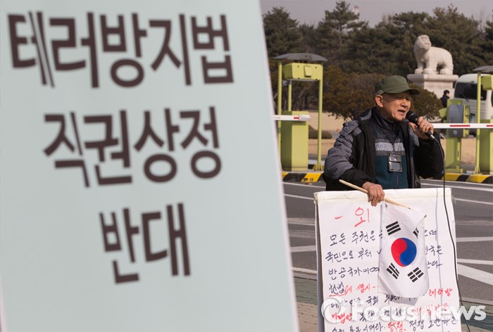 (서울=포커스뉴스) 25일 오전 서울 여의도 국회 앞에서 한 보수단체 회원이 테러방지법 반대를 위해 무제한토론(필리버스터)을 이어가는 야당을 규탄하며 발언하고 있다.