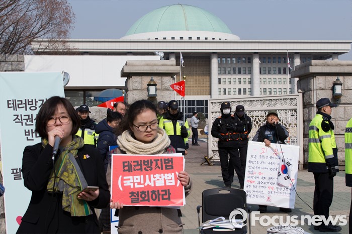 (서울=포커스뉴스) 25일 오전 서울 여의도 국회 앞에서 한 보수단체 회원이 테러방지법 반대를 위해 무제한토론(필리버스터)을 이어가는 야당을 규탄하며 발언하고 있다. 사진 왼쪽은 테러방지법 철회를 요구하며 필리버스터에 참가해 발언하는 시민들.