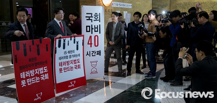 (서울=포커스뉴스) 테러방지법 직권상정에 반발해 야당의 무제한 토론(필리버스터)이 사흘째 진행되고 있는 25일 오전 서울 여의도 국회 본회의장 앞에서 김성태(왼쪽), 권성동 새누리당 의원이 무제한 토론 비판 시위를 하고 있다.
