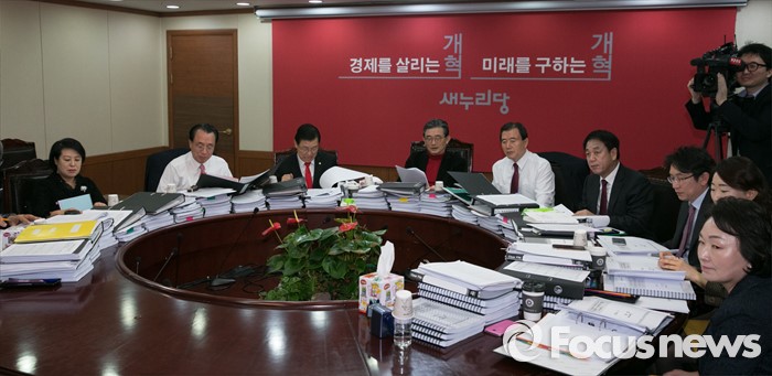 (서울=포커스뉴스) 25일 오전 서울 여의도 새누리당사에서 열린 20대 총선 공천 신청자 면접심사에 참석한 이한구 공천관리위원장과 위원들이 예비후보들에게 질문하고 있다.