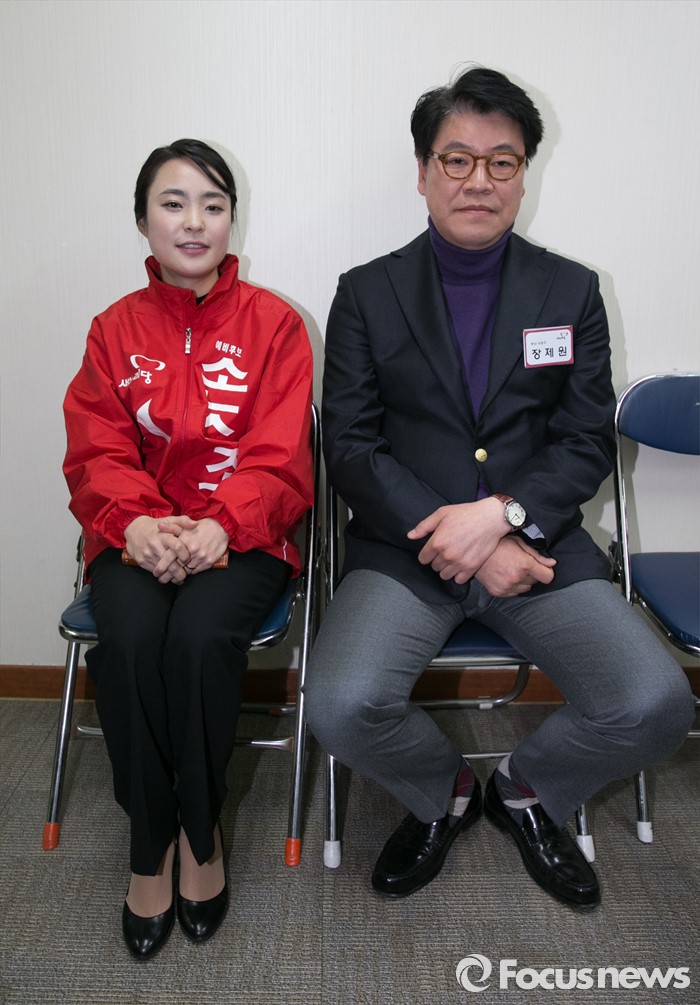 (서울=포커스뉴스) 25일 오전 서울 여의도 새누리당사에서 열린 20대 총선 공천 신청자 면접심사에 참석한 손수조(왼쪽), 장제원 부산 사상구 예비후보가 면접을 기다리고 있다.