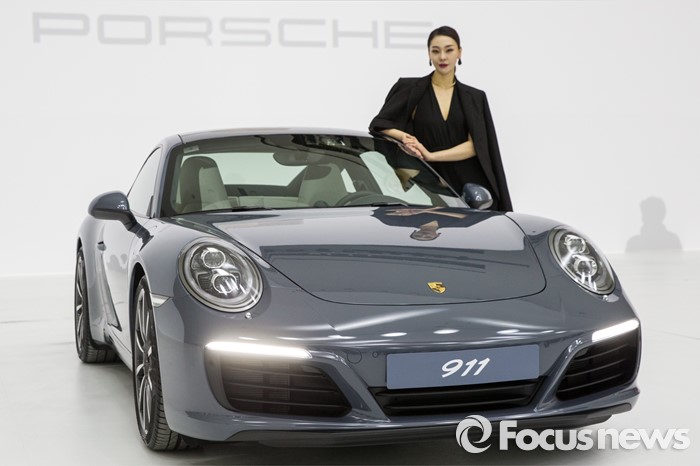 (서울=포커스뉴스) 25일 오전 서울 중구 동대문디지털플라자에서 모델이 포르쉐 신형 911 카레라를 선보이고 있다.