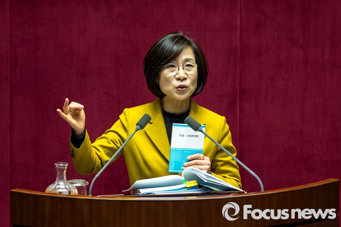(서울=포커스뉴스) 테러방지법 직권상정에 반발해 야당의 무제한 토론(필리버스터)이 사흘째 진행되고 있는 25일 오후 서울 영등포구 국회 본회의장에서 김제남 정의당 의원이 헌법-국회관계법 책을 든 채 발언을 이어가고 있다.