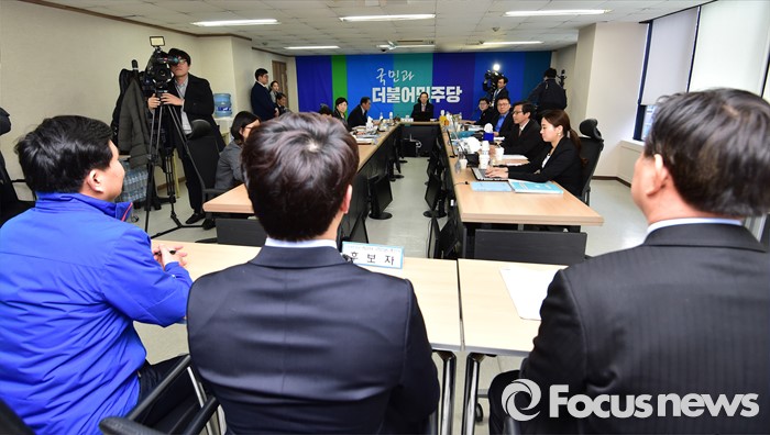 (서울=포커스뉴스) 25일 오전 서울 여의도 더불어민주당사에서 열린 20대 총선 공천 신청자 면접심사에 참석한 박영순, 고재일, 정현태 대전 대덕 예비후보가 홍창선 공천관리위원장 질의에 답하고 있다.