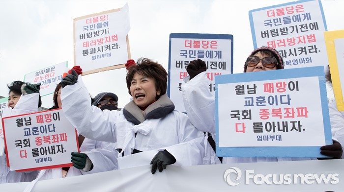 (서울=포커스뉴스) 25일 오후 서울 여의도 국회의사당 앞에서 엄마부대가 봉사단 회원들이 테러방지법을 반대하는 더불어민주당을 규탄하며 구호를 외치고 있다.