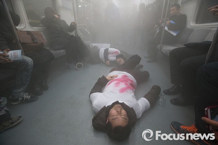(서울=포커스뉴스) 25일 오후 서울 마포구 월드컵경기장역에서 실시한 지하철 대형사고 대응 불시 현장훈련에서 승객역을 맡은 시민들이 쓰러져 있다.