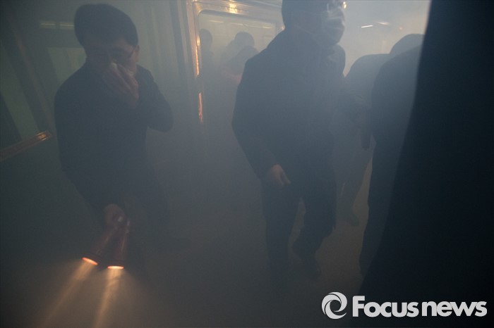 (서울=포커스뉴스) 25일 오후 서울 마포구 월드컵경기장역에서 실시한 지하철 대형사고 대응 불시 현장훈련에서 승객들이 대피하고 있다.