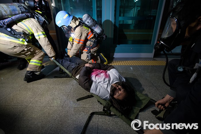 (서울=포커스뉴스) 25일 오후 서울 마포구 월드컵경기장역에서 실시한 지하철 대형사고 대응 불시 현장훈련에서 소방관들이 구조활동을 하고 있다.