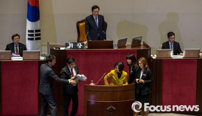 (서울=포커스뉴스) 테러방지법 직권상정에 반발해 야당의 무제한 토론(필리버스터)이 사흘째 진행되고 있는 25일 오후 서울 영등포구 국회 본회의장에서 김제남 정의당 의원이 발언을 마친 뒤 연단 주변을 정리하고 있다.