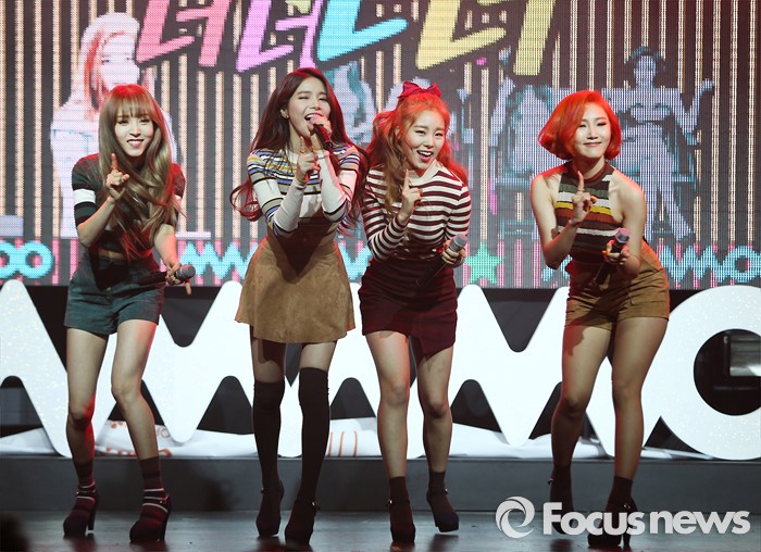 (서울=포커스뉴스) 25일 오후 서울 마포구 예스24 무브홀에서 열린 걸그룹 마마무의 정규 1집 'Melting' 쇼케이스에 참석한 멤버들이 신곡 무대를 선보이고 있다. 왼쪽부터 문별, 솔라, 휘인, 화사