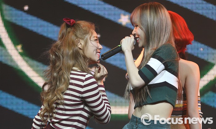 (서울=포커스뉴스) 25일 오후 서울 마포구 예스24 무브홀에서 열린 걸그룹 마마무의 정규 1집 'Melting' 쇼케이스에 참석한 멤버 휘인(왼쪽)과 문별이 신곡무대를 선보이고 있다.