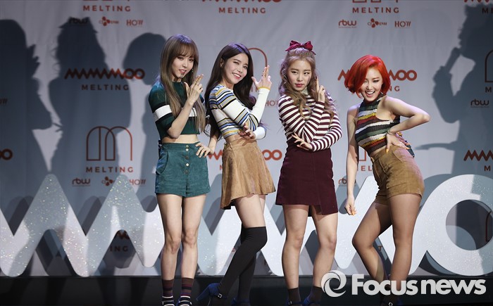 (서울=포커스뉴스) 25일 오후 서울 마포구 예스24 무브홀에서 열린 걸그룹 마마무의 정규 1집 'Melting' 쇼케이스에 참석한 멤버들이 포토타임을 갖고 있다. 왼쪽부터 문별, 솔라, 휘인, 화사.