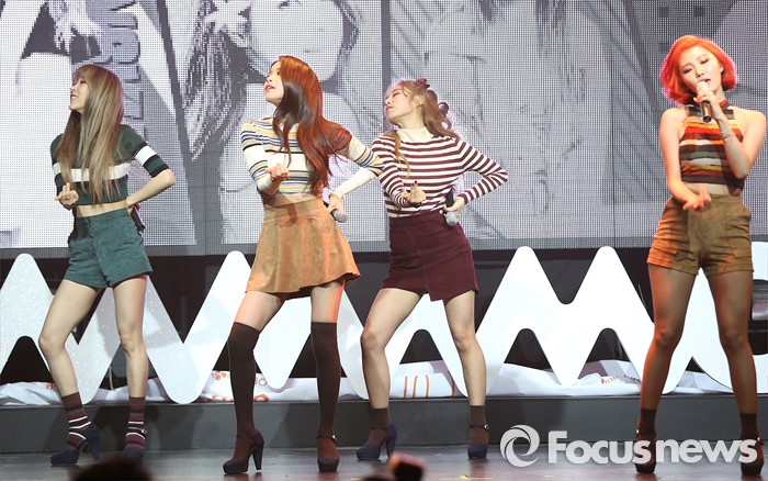 (서울=포커스뉴스) 25일 오후 서울 마포구 예스24 무브홀에서 열린 걸그룹 마마무의 정규 1집 'Melting' 쇼케이스에 참석한 멤버들이 신곡무대를 선보이고 있다. 왼쪽부터 멤버 문별, 솔라, 휘인, 화사.