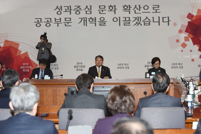(서울=포커스뉴스) 유일호 부총리 겸 기획재정부 장관이 25일 서울 종로구 정부서울청사 별관에서 열린 공공기관 기관장 워크숍에 참석해 모두발언을 하고 있다. <사진제공=기획재정부>