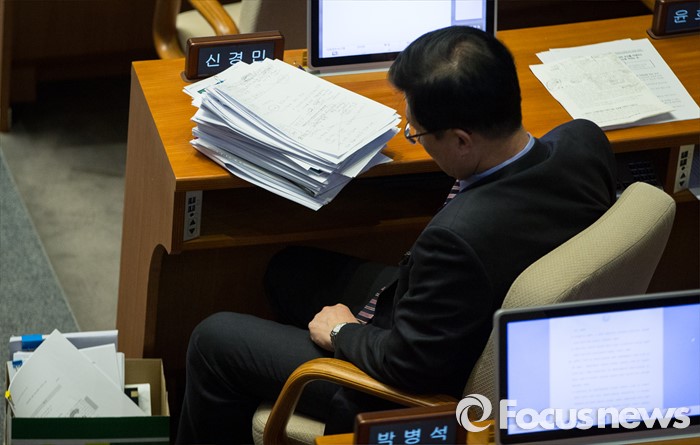 (서울=포커스뉴스) 테러방지법 직권상정에 반발해 야당의 무제한 필리버스터(무제한 토론)가 사흘째 진행되고 있는 25일 오후 서울 여의도 국회 본회의장에서 신경민 더불어민주당 의원이 자신이 토론할 자료를 보며 생각에 잠겨 있다.