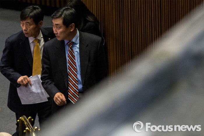 (서울=포커스뉴스) 테러방지법 직권상정에 반발해 야당의 무제한 토론(필리버스터)이 사흘째 진행되고 있는 25일 오후 서울 영등포구 국회 본회의장에서 이종걸 더불어민주당 원내대표가 동료의원들과 대화를 나눈 뒤 회의장을 나서고 있다.