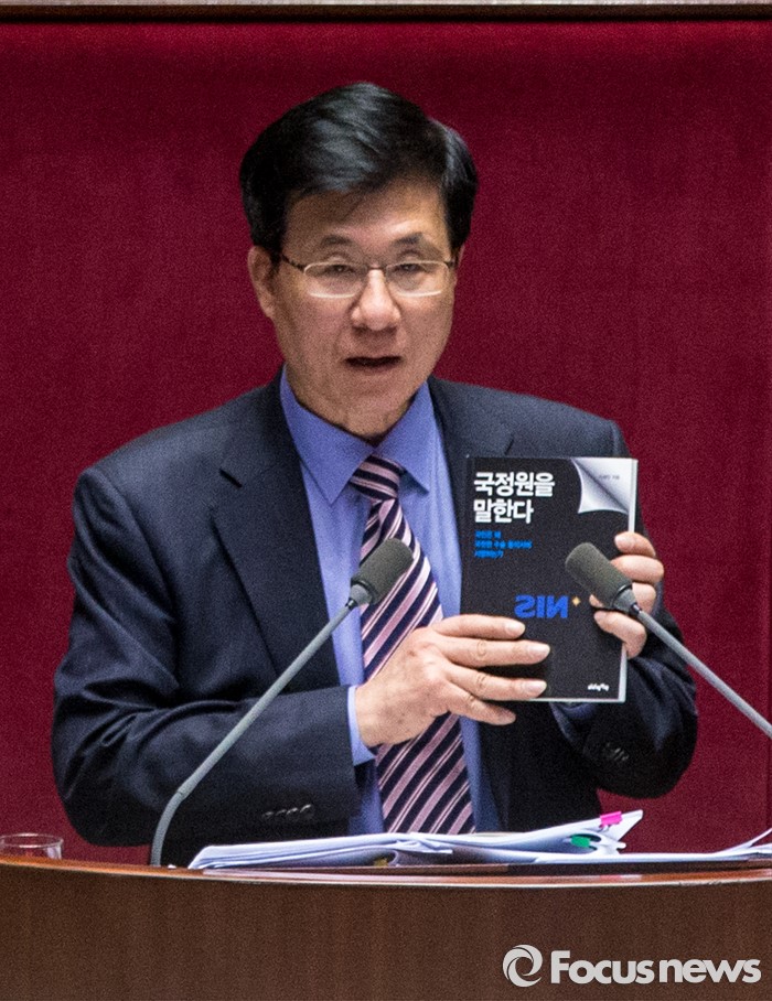 (서울=포커스뉴스) 테러방지법 직권상정에 반발해 야당의 무제한 토론(필리버스터)이 사흘째 진행되고 있는 25일 오후 서울 영등포구 국회 본회의장에서 신경민 더불어민주당 의원이 본인의 저서인 '국정원을 말한다'를 보이며 발언을 이어가고 있다.