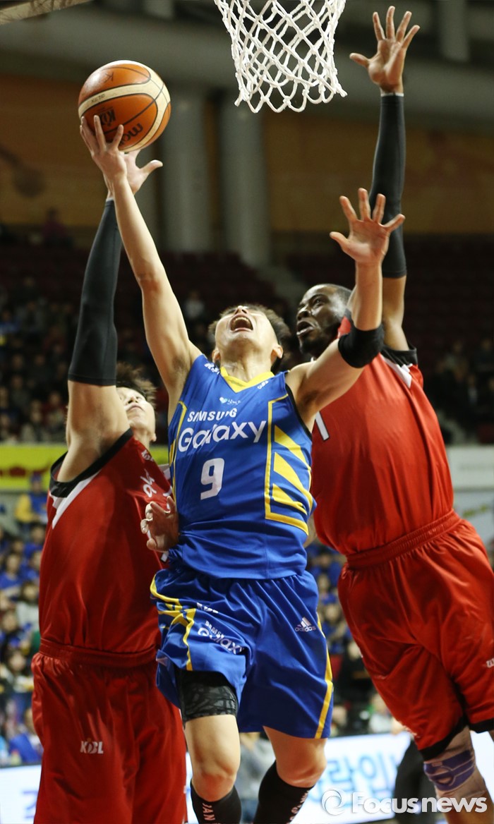 (안양=포커스뉴스) 25일 안양실내체육관에서 열린 2015-2016 프로농구 6강 플레이오프 KGC-삼성 1차전에서 삼성 주희정이 KGC 오세근과 찰스 로드의 수비 사이로 레이업슛을 시도하고 있다.