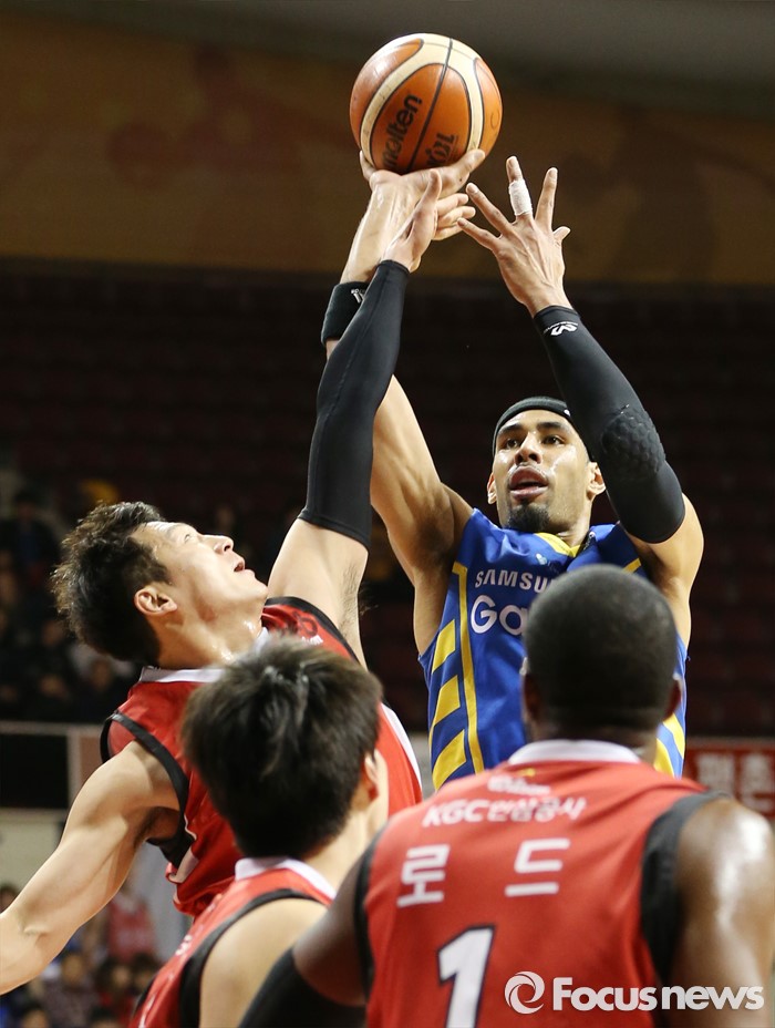 (안양=포커스뉴스) 25일 안양실내체육관에서 열린 2015-2016 프로농구 6강 플레이오프 KGC-삼성 1차전에서 삼성 문태영이 KGC 이정현의 블록 위로 점프슛을 시도하고 있다.