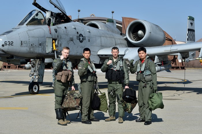 (서울=포커스뉴스) 지난 24일 경기도 평택시 주한미군 오산공군기지에서 열린 쌍매훈련에 앞서 미 공군의 A-10 공격기 앞에서 한·미 공군 조종사들이 완벽한 연합작전 임무수행을 다짐하며 포즈를 취하고 있다. <사진제공=공군>