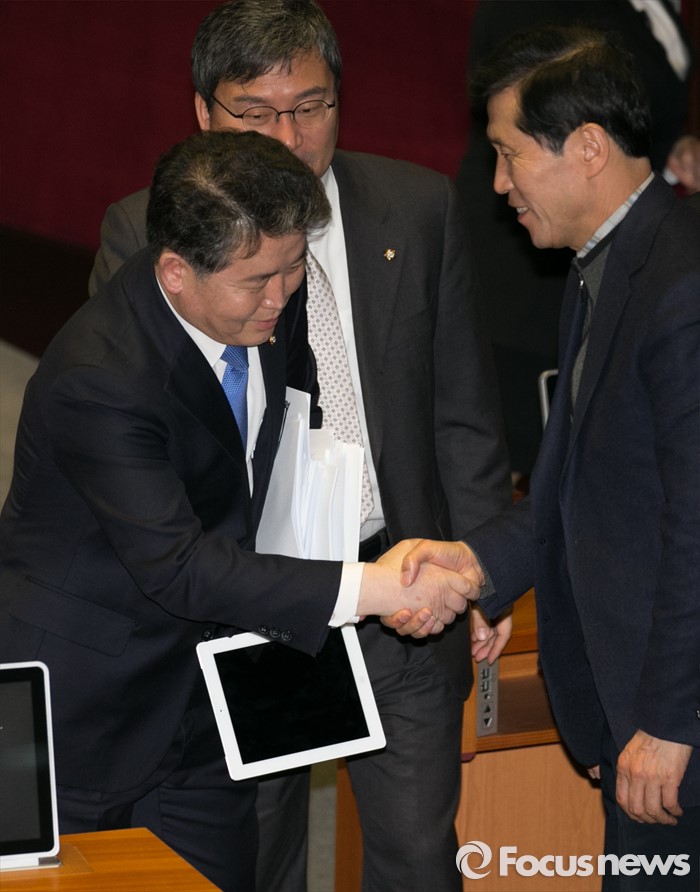 (서울=포커스뉴스) 테러방지법 직권상정에 반발해 야당의 무제한 토론(필리버스터)이 나흘째 진행되고 있는 26일 오전 서울 여의도 국회 본회의장에서 김경협 더불어민주당 의원이 토론을 마친 뒤 동료 의원들로부터 격려받고 있다.