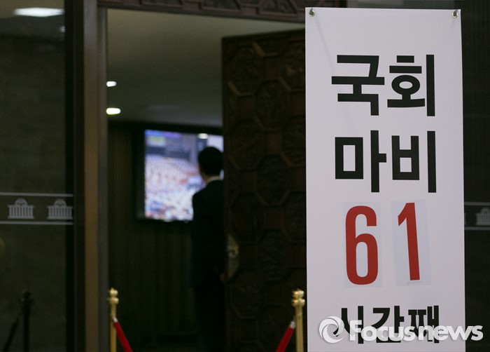 (서울=포커스뉴스) 테러방지법 직권상정에 반발해 야당의 무제한 토론(필리버스터)이 나흘째 진행되고 있는 26일 오전 서울 여의도 국회 본회의장 앞에 새누리당의 무제한 토론을 비판하는 배너가 세워져 있다.