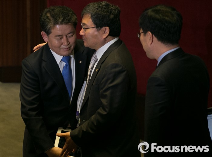 (서울=포커스뉴스) 테러방지법 직권상정에 반발해 야당의 무제한 토론(필리버스터)이 나흘째 진행되고 있는 26일 오전 서울 여의도 국회 본회의장에서 김경협(왼쪽) 더불어민주당 의원이 토론을 마친 뒤 동료 의원들로부터 격려받고 있다.